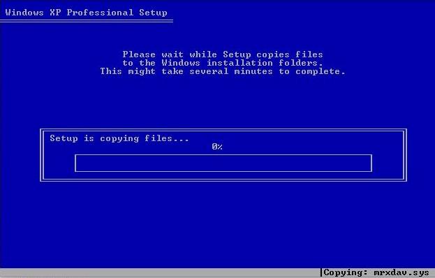 | The files on your Windows XP cd is going to be copied onto your hard disk drive. It will take a WHILE. So, you should go get something to drink or have a walk or watch tv.:) |